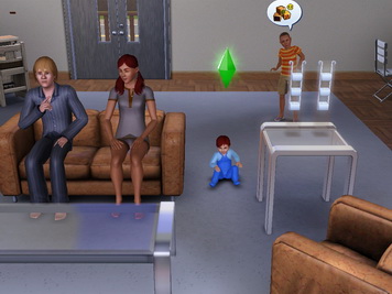 Najlepsze jest to zdjęcie gdzie Simka uczy młodocianą mówić... No przecież każdy wie, że dziecko przede wszystkim musi wiedzieć, co to jest śmierć... A jak ulubiony chomiczek pójdzie do lepszego świata..? No tak, w tej grze nie ma chomiczków... No to rybka, lub motylek. To mi przypomina czarny humor, "Rodzinę Adamsów".